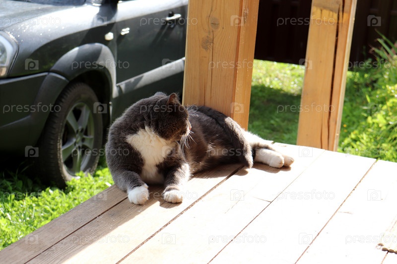 Серый кот лежит летом на крыльце и смотрит в сторону