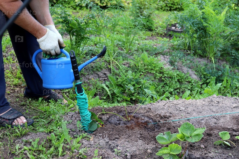 Мужские ноги и руки с лейкой около грядки с кустом клубники в саду летом