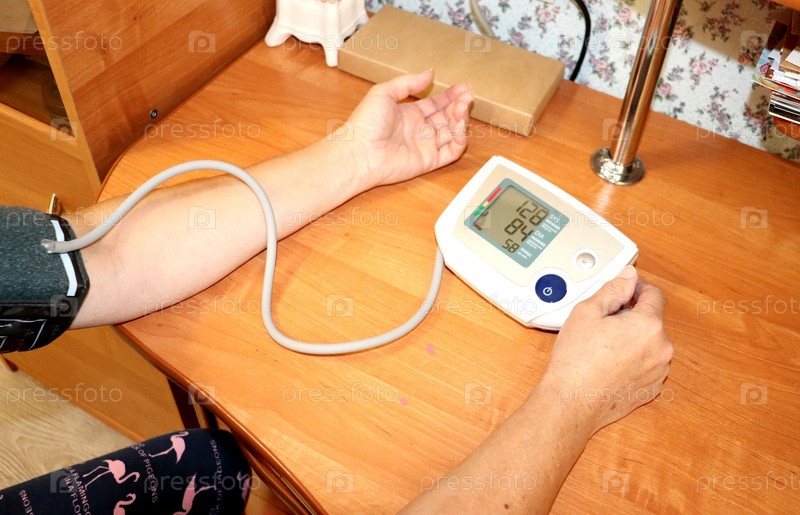 Женские руки с манжетой и электронный тонометр - измерение артериального давления