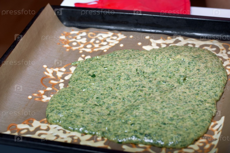 Женщина выкладывает тесто на противень, чтобы сделать торт. Для приготовления бисквитного рулета со шпинатом и мятой. С начинкой из клубники. Ингредиенты для приготовления