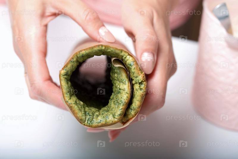 Женщина сворачивает испеченный пирог в трубочку. Для приготовления бисквитного рулета со шпинатом и мятой. С начинкой из клубники. Ингредиенты для приготовления