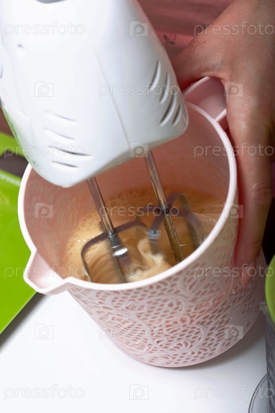 Женщина взбивает тесто блендером. Для приготовления бисквитного рулета со шпинатом и мятой. С начинкой из клубники. Ингредиенты для приготовления