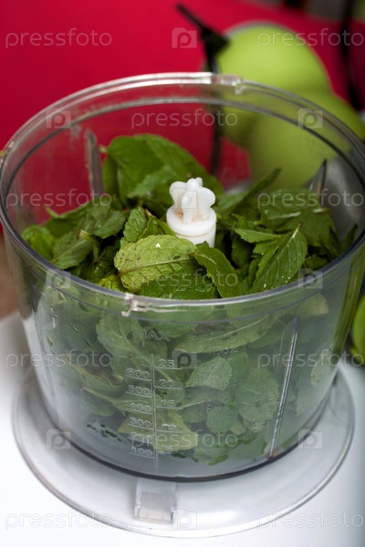 Шпинат и мята в чаше блендера для измельчения. Для приготовления бисквитного рулета со шпинатом и мятой. С начинкой из клубники. Ингредиенты для приготовления