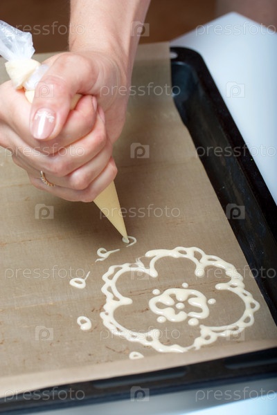 Женщина делает узор из теста на противне. Для приготовления бисквитного рулета со шпинатом и мятой. С начинкой из клубники. Ингредиенты для приготовления