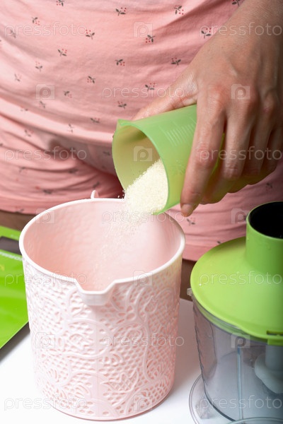 Женщина насыпает сахар в емкость для приготовления теста. Для приготовления бисквитного рулета со шпинатом и мятой. С начинкой из клубники. Ингредиенты для приготовления