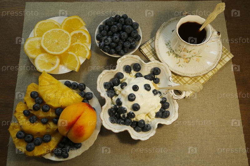 Завтрак творог со сметаной и ягодами. Черный кофе, лимон, фрукты. Кисломолочная диета
