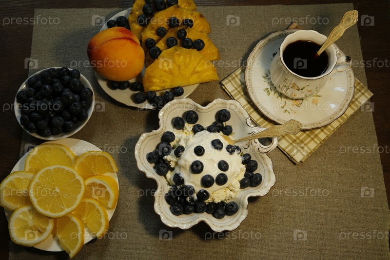 Завтрак творог со сметаной и ягодами. Черный кофе, лимон, фрукты. Кисломолочная диета