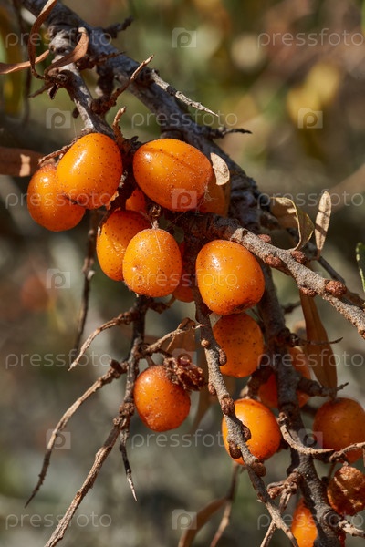 Облепиха созрела на садовом участке. Ягоды облепихи на фоне голубого неба и зеленых листьев