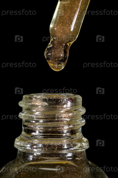 Капает мерцающее эфирное масло в бутылку на черном фоне. Уход за кожей. Эффект сияющей кожи