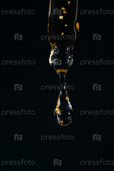 Жидкая сыворотка и пипетка на черном фоне, макро. Капля сыворотки из 24-каратного золота выпадает из пипетки