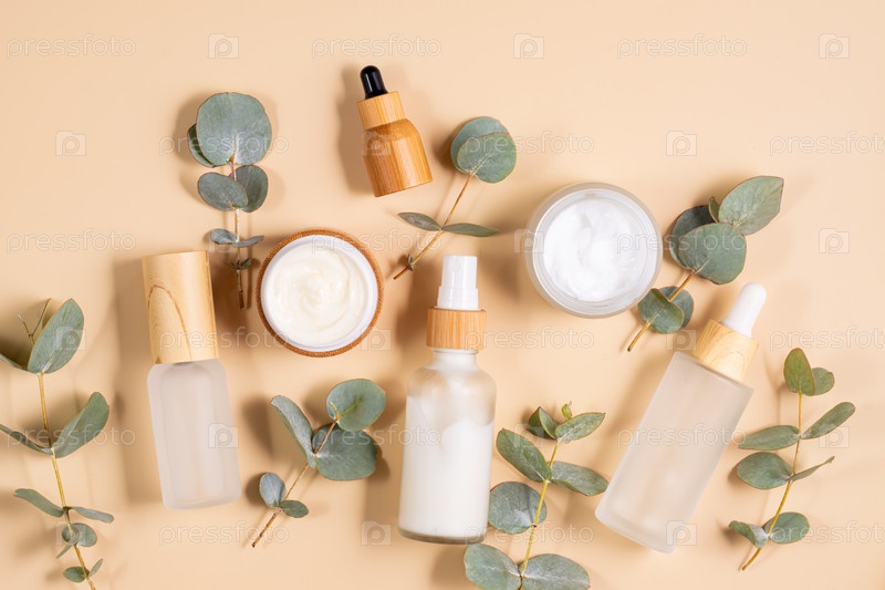 Набор косметических средств в стеклянных и бамбуковых флаконах на бежевом фоне с листьями эвкалипта. Набор средств по уходу за кожей для ежедневной рутины. Макет для дизайнеров