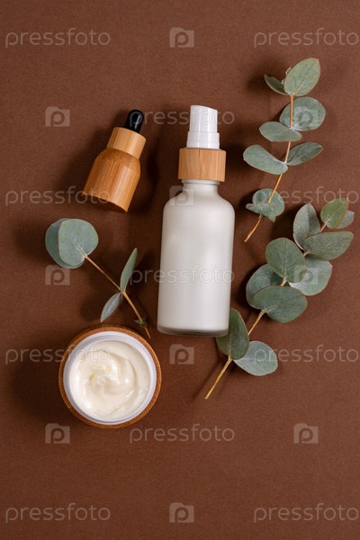 Антивозрастная коллагеновая сыворотка для лица в бамбуковой бутылке и крем для лица на коричневом фоне с эвкалиптом. Концепция натуральной органической косметики. Макет для брендинга