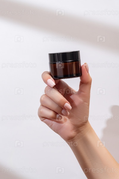 Женская рука держит макет темной стеклянной банки с кремом. Немаркированная упаковка для косметики в солнечном свете на белом фоне. Концепция ухода за кожей. Резкие тени