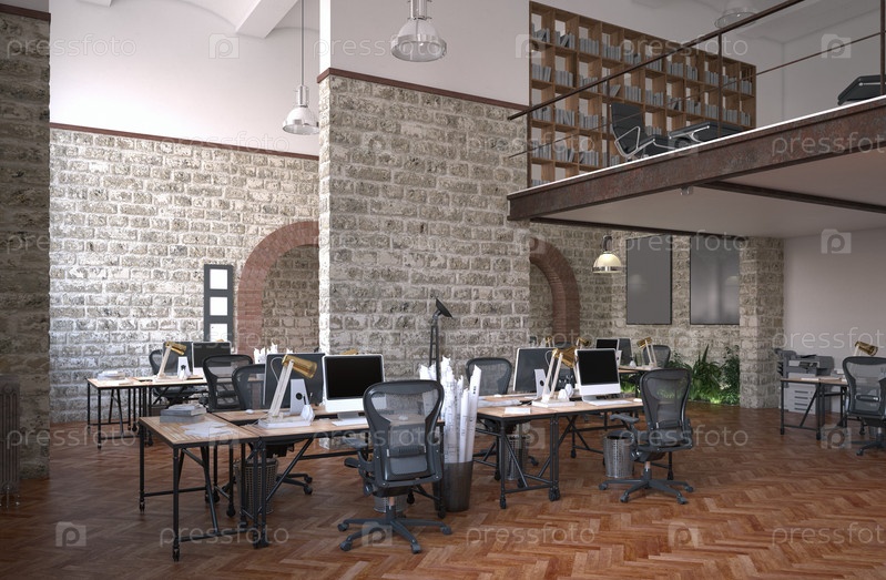 Промышленный офис с кирпичными стенами и современным декором