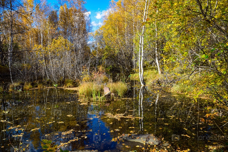 Хакасия, Сундуки, мегалитические структуры, останцы,осенние листья в воде