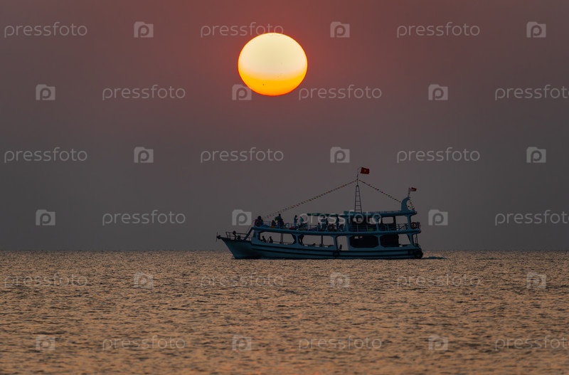 Морской прогулочный катер с туристами на фоне оранжевого диска заходящего за горизонт солнца