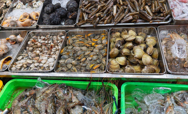 Вкусная азиатская кухня, еда на ночном рынке. Традиционная уличная еда из различных морских деликатесов. Необычная еда для туристов