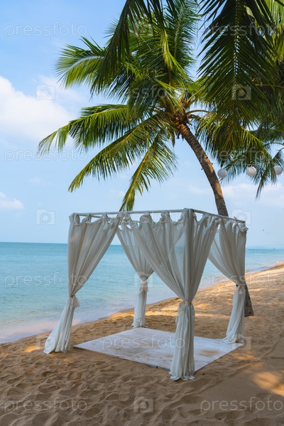 Деревянный пляжный навес с белыми занавесками под пальмой на тропическом райском острове на фоне голубого неба и морского бриза