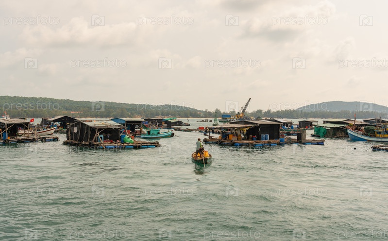 Вьетнам, плавучие дома на воде, которые являются рыбными фермами, на одном из них есть экскаватор