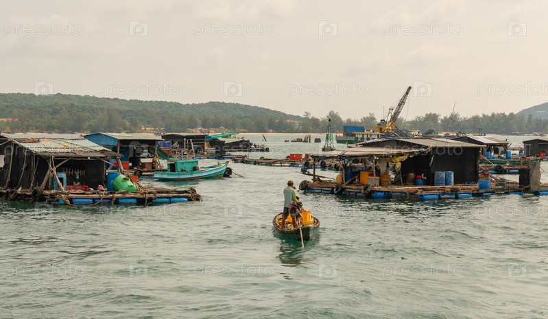 Вьетнам, плавучие дома на воде, которые являются рыбными фермами, на одном из них есть экскаватор