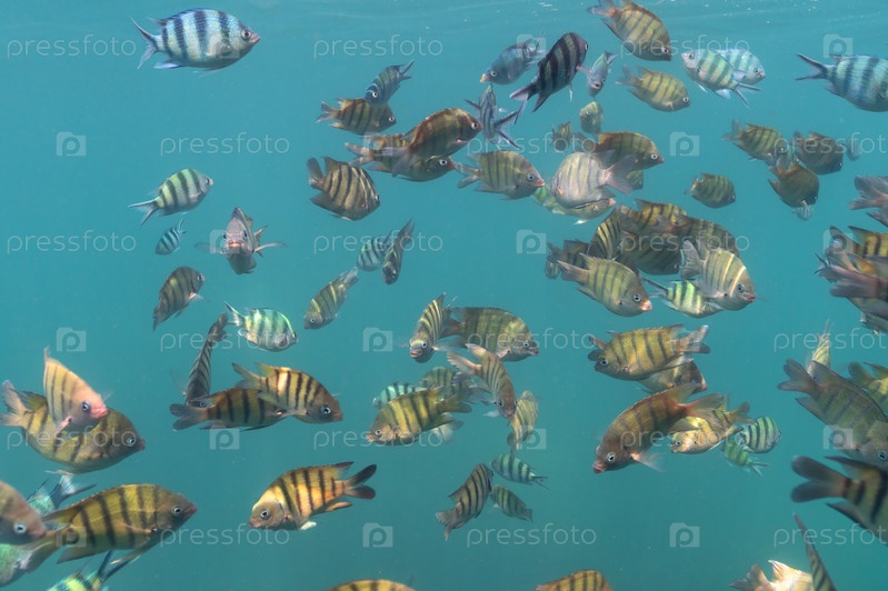 Стая разноцветных рыб, живущих в коралловых рифах