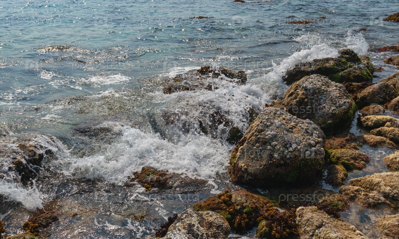 Волны разбиваются о скалистый берег тропического острова, крупный план