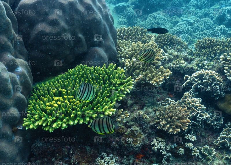 Подводный пейзаж кораллового рифа с красочными экзотическими рыбами