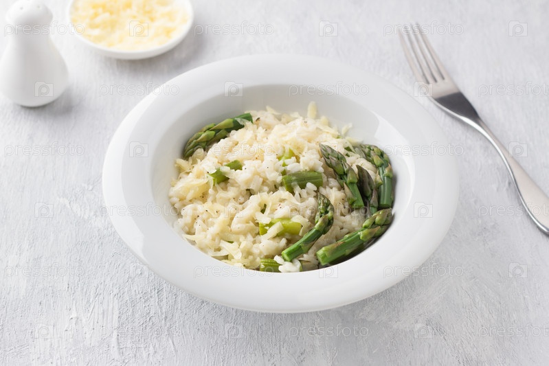 Белая тарелка вкусного сливочного ризотто со спаржей и сыром на светло-сером фоне. традиционная итальянская еда