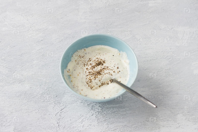 Миска со сметаной или йогуртом, майонезом, зерновой горчицей и специями на светло-сером фоне. Приготовление заправки для салата