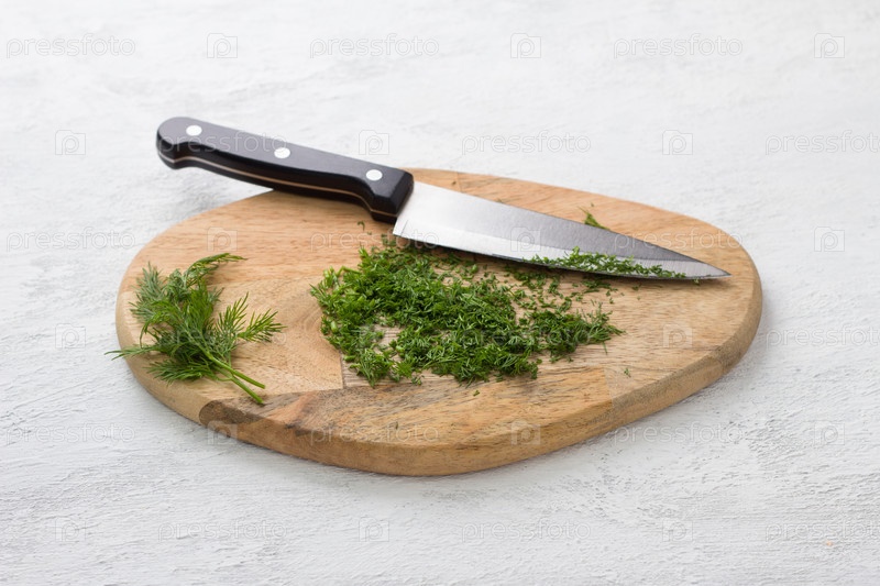 Деревянная доска с нарезанным укропом и ножом на светло-сером фоне