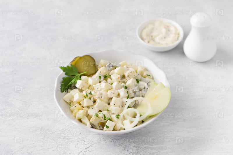 Традиционный польский салат с яблоком, маринованным огурцом, луком и майонезом на светло-сером фоне