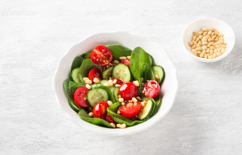Тарелка с салатом из свежих листьев шпината, огурцов, помидоров черри и кедровых орешков с заправкой на светло-сером фоне. вкусная здоровая еда