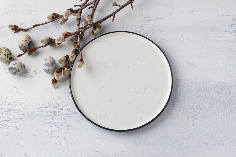 Белая тарелка, ветки вербы, яйца на светло-голубом фоне, пасхальная композиция. вид сверху