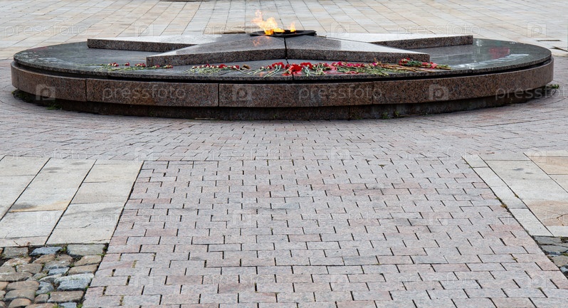 Пламя Вечного огня на каменной мостовой на городской площади в Парке Победы города Омска летом