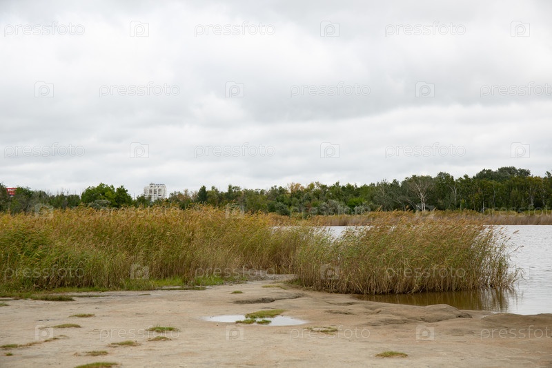 Озеро с камышами в Омском парке Победы летом