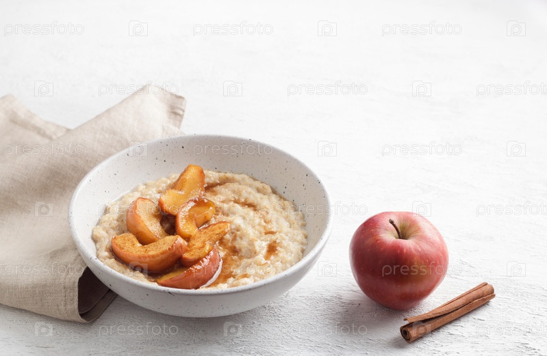 Сладкая овсяная каша с дольками печеного яблока, корицей и карамельным соусом в серой миске на светлом фоне