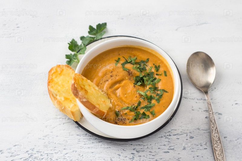 Веганский крем-суп из красной чечевицы и овощей с кокосовым молоком, посыпанный рубленой петрушкой в белой миске и сырными гренками на светло-сером фоне
