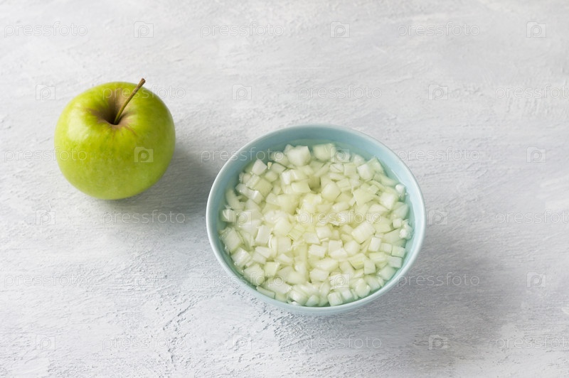 Миска замоченного нарезанного лука для салата и одно зеленое яблоко на светло-сером фоне. Приготовление традиционного польского салата, шаг за шагом