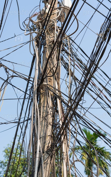 Хаотично соединенные и натянутые провода на электрическом столбе в Азии