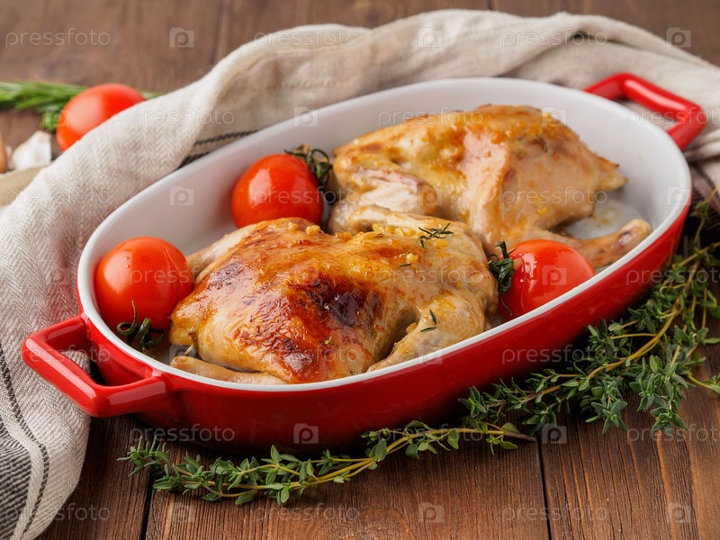 Две тушки жареной курицы в миске, запеченные в духовке лопатки с помидорами, с хрустящей корочкой на темно-коричневом деревянном деревенском столе, вид сбоку