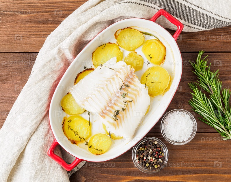 Рыба треска запеченная в духовке с картофелем и специями и тимьяном - здоровое питание здоровое питание. Темный деревянный коричневый фон, вид сверху