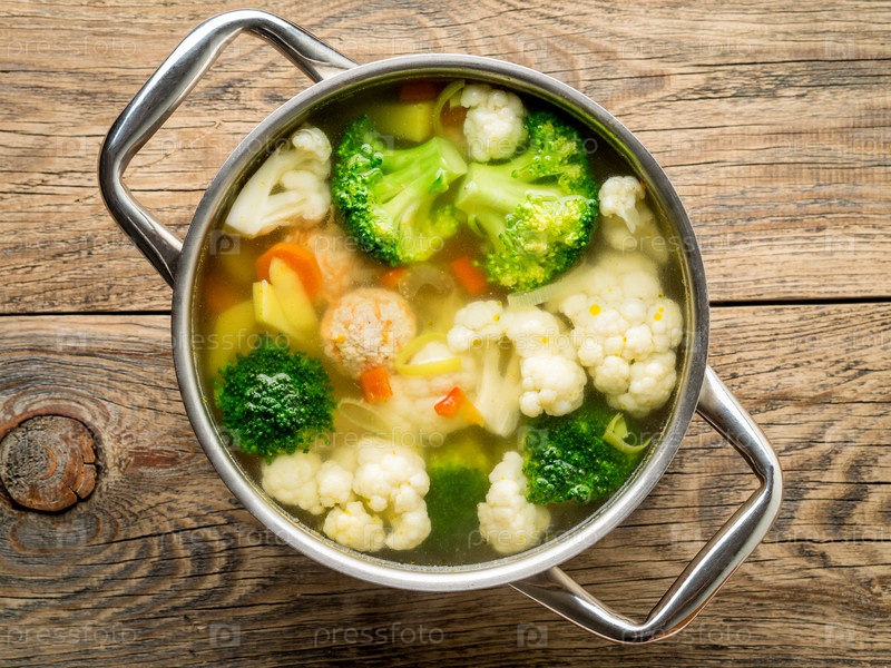 Большая металлическая кастрюля с вкусным горячим супом из овощей и фрикаделек, цветной капустой, брокколи, морковью, перцем, картофелем, здоровой диетической пищей, вид сверху