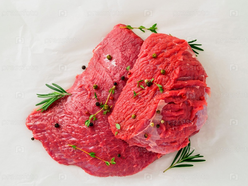 Сырая говядина с приправой розмарин, перец на белой пергаментной бумаге, вид сверху