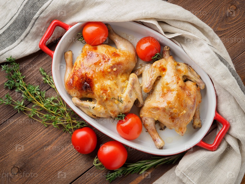 Две тушки жареной курицы в миске, запеченные в духовке лопатки с помидорами, с хрустящей корочкой, на темно-коричневом деревянном деревенском столе, вид сверху