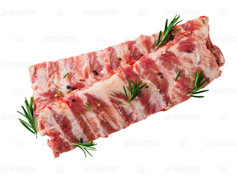 Изолированное изображение сырых свиных ребрышек с приправой розмарин, перец на белом фоне, вид сверху