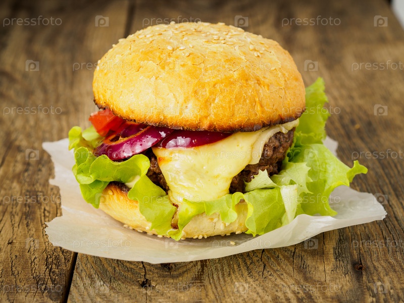 Вкусный бургер с говяжьей котлетой, сыром, луком, помидором и салатом на поджаренных булочках. Американский фастфуд, нездоровое питание. Вид сбоку, селективный фокус