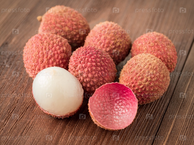 Свежие спелые плоды личи на деревянном столе, макро, вид сбоку