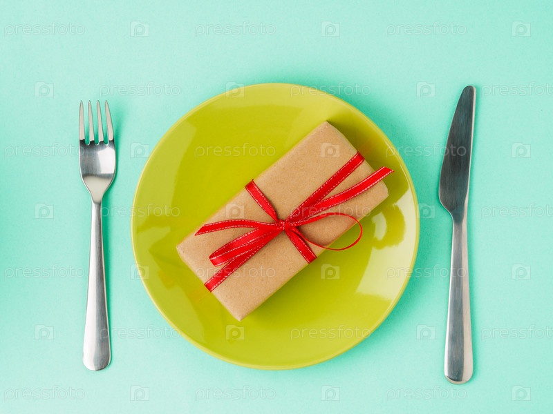 Подарок, упаковка крафт-бумаги коричневого цвета с красной лентой на желтой тарелке, нож, вилка на ярко-бирюзовом фоне, вид сверху. День святого Валентина