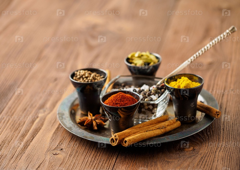 Восточный набор специй - кориандр, красный перец, куркума, корица, бадьян, розмарин, различные приправы в металлических чашках, на коричневом деревянном столе, вид сбоку, макро, селективный фокус