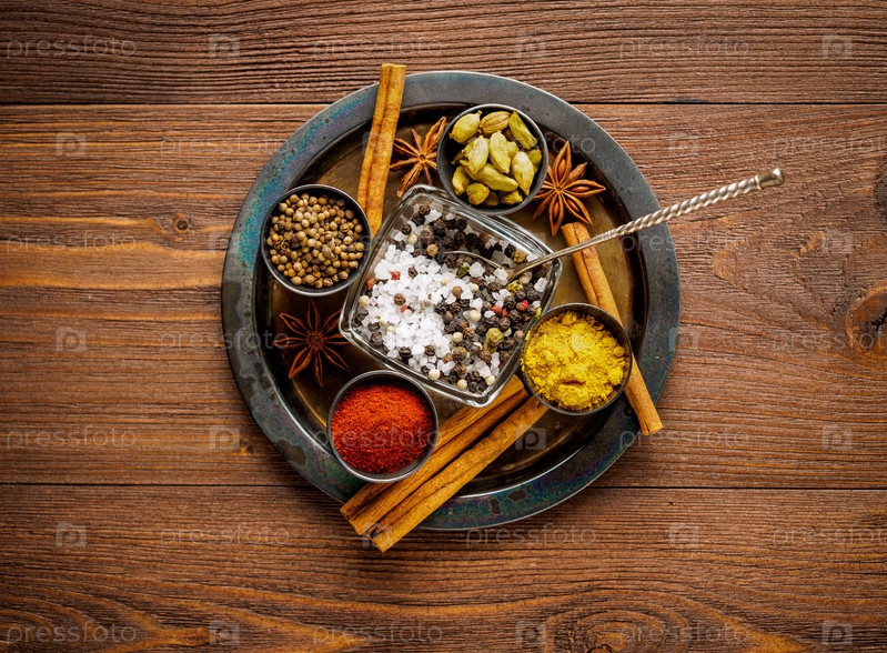Восточный набор специй - кориандр, красный перец, куркума, корица, бадьян, различные приправы в металлической тарелке, на коричневом темном деревянном столе, вид сверху, макро